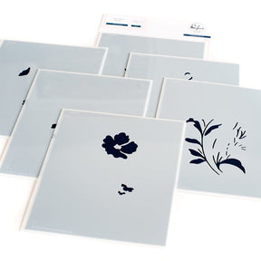 6 piece layering stencil set made to coordinate with the With Sympathy stamp set, With Sympathy hot foil plate and With Sympathy die. There is a separate stencil for each layer, with guidelines on each stencil for perfect alignment when using alone. When using the stencils with the stamped images you will forego the alignment guides, and instead align each layer to the stamped images.