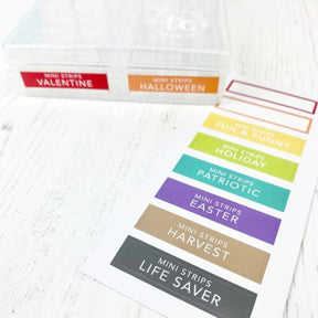 Our Mini Strips Simple Storage Stickers are a set of pre-printed labels with the names of all of our Mini Strips stamps, sized perfectly to adhere to the side of the Simple Storage for Simple Strips cases so you can categorize your sentiments by stamp and find the strips you're looking for at a glance.