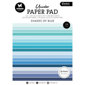 Essentials by Studio Light. Unicolor paper pad Shades of blue. A5 / 14,8x21cm / 5,8x8,3 inch. 9x4 double-sided unicolor paper. 36 sheets, 18 colors total. 170gsm cardstock. Acid & lignin free. Pad: 148x210x9mm.