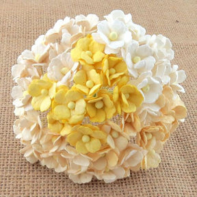 Mixed white & cream sweetheart blossom flowers handmade from very fine quality mulberry paper. Measure approx 15mm across the flower, with a 6cm green stem. Each pack contains approx 100 flowers.