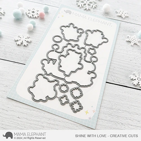 The Mama Elephant Shine With Love Clear Stamp and Die Set includes both the Shine With Love clear stamps and the coordinating Shine With Love Creative Cuts dies. This set features 14 adorable images and 1 sentiment, showcasing some of your favorite Mama Elephant critters, including a yeti, cat, dog, chick, bunny, hedgehog, fox, and hamster, all celebrating with sparklers and party hats. The coordinating dies make it easy to cut out the stamped images, allowing you to create delightful and festive scenes for your card making and crafting projects.
