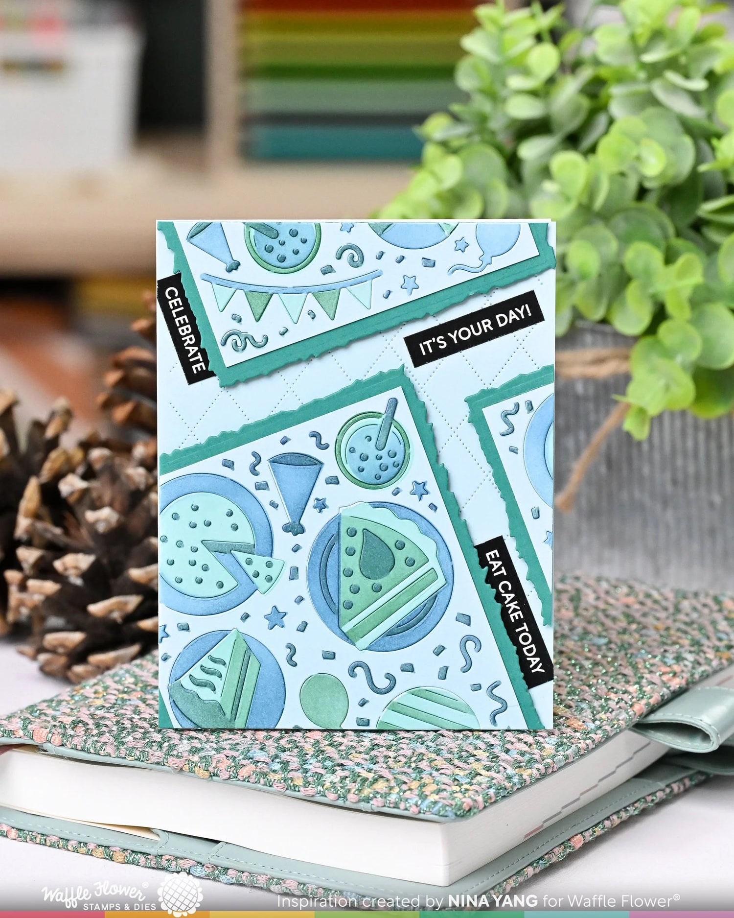 This Sepia Layers Stencil is designed for quick projects. Use 4 shades (light to dark) with one color per layer, no masking needed. The Cake Time Stencil gives you more flexibility for colorful looks and is ideal for adding glitter paste to the confetti, since they’re all on one layer.