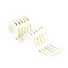 Add golden stripes to your projects with this gorgeous washi tape featuring fine painted stroke lines foiled in gold. This tape measures approximately 1.625" (42mm) wide and 32.8" (10mm) long.