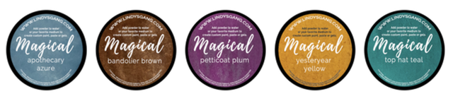 Nuneka is at it again! Do you love steampunk as much as we do? All those scrumptious rich colors? Some gears, victorian fashion, and science fiction thrown in? Well, we've got a set that is going to blow your socks off! Designed for use on everything from paper to wood, the dye-based powders are non-toxic and acid-free. Sprinkle them directly onto a porous surface and spray it with water for a vibrant stain, or mix them into different mediums to create potent pastes. 0.25oz jar. Non-toxic, acid-free powdered dyes. Contains pearlized mica powders, powdered dye based pigments & a fixative. New colors are not duplicated in our rainbow. Made in the USA. STEAMPUNK SOIREE spray set includes the following colors: Apothecary Azure- that perfect denim-y blue; Bandolier Brown- a rich coppery brown with gold shimmer; Petticoat Plum- a deep, rich plum-y purple with a silver shimmer; Yesteryear Yellow- a deep yellow color with vintage gold shimmer; Top Hat Teal- a rich and vibrant teal with silver shimmer.
