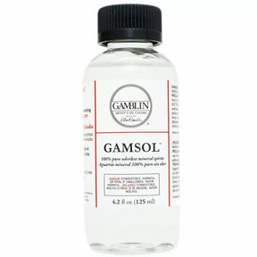Gamsol is an excellent solvent for thinning Gamblin mediums and for general painting. It evaporates 100% and leaves no residue in paint layers. Gamsol is less toxic than other brands of OMS (Odorless Mineral Spirits), mineral spirits, or turpentine because the harmful aromatic solvent component has been removed. It’s also useful for studio and brush cleanup.