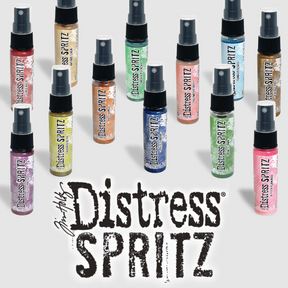 Distress Spritz ... by Tim Holtz and Ranger - a pearlised fusion of colourful mica pigment and clear medium to create a shimmery splattery effect on paper and card surfaces in colours that compliment the whole Distress rainbow. Each bottle contains 1 fl oz (29ml) with a fine spritzing nozzle and easy to hold container. Choose one colour or buy all 12 gorgeous colours!