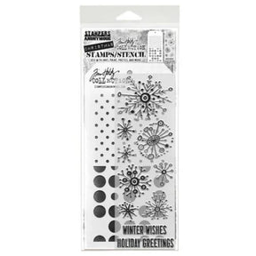 Tim Holtz Mixed-Media Stamps & Stencil Set: Retro Flakes. Tim Holtz Mixed Media Set includes clear photopolymer stamps & a custom layering stencil designed to add texture & imagery to your creativity. Use with your favorite inks, paints, sprays, and embossing pastes. Clear Stamp images based on the Retro Flakes Cling Stamps CMS417. The stencils are inspired by Spots THS180 and Polkadot THS068. Package contains clear stamps and a combo stencil.