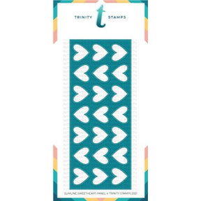 This single die cuts out a 8.5" x 3.5" embossed edge panel that also cuts out a total of 21 small hearts in a vertical fashion. There is also an embossing and stitching edge around each of the small hearts.